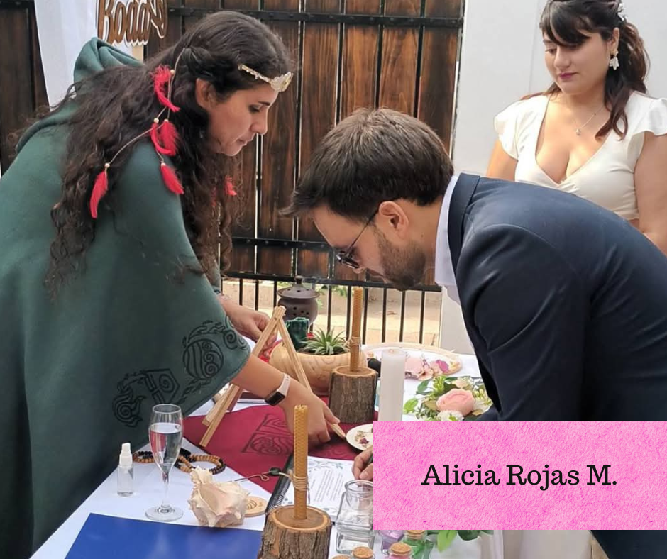 Alicia es una mujer medicina y sacerdotisa del amor, dedicada a guiar ceremonias sagradas que honran la unión de dos almas desde la energía pura del corazón y la conexión con los cuatro elementos.